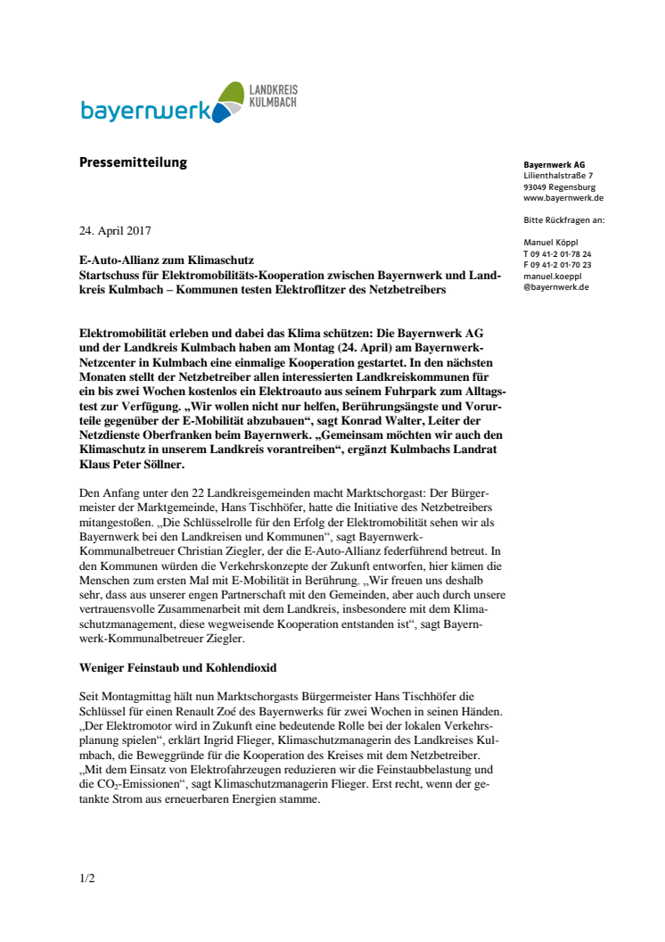 Startschuss für Elektromobilitäts-Kooperation zwischen Bayernwerk und Landkreis Kulmbach – Kommunen testen Elektroflitzer des Netzbetreibers