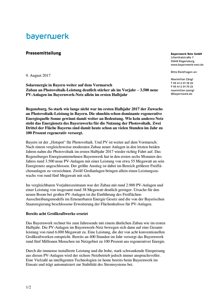 Zubau an Photovoltaik-Leistung deutlich stärker als im Vorjahr – 3.500 neue PV-Anlagen im Bayernwerk-Netz allein im ersten Halbjahr