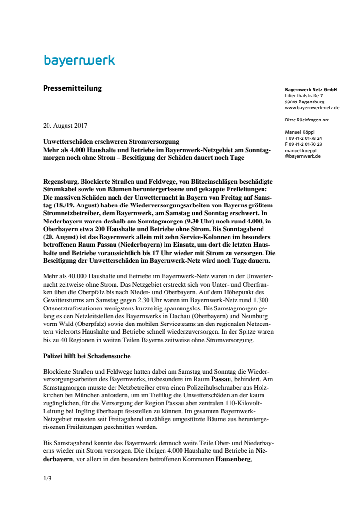 Mehr als 4.000 Haushalte und Betriebe im Bayernwerk-Netzgebiet am Sonntagmorgen noch ohne Strom – Beseitigung der Schäden dauert noch Tage