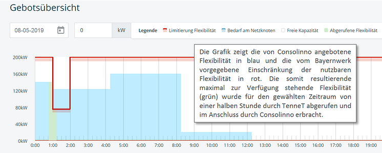 Bei einem Testabruf wurde auf Anforderung von TenneT die Einspeisung einer von Consolinno gesteuerten KWK-Anlage, die am Nieder- und Mittelspannungsnetz des Bayernwerks angebunden ist, erhöht, um Engpasssituationen zu vermeiden.