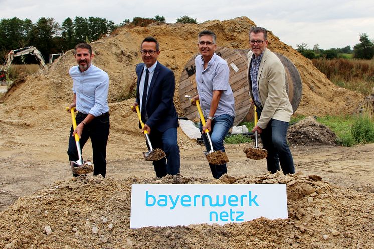 Auftakt für die Stromerschließungsarbeiten im Gewerbegebiet Reichertshofen. Den Spatenstich feierten Josef Bestle, Bayernwerk-Kommunalbetreuer, Bürgermeister Michael Franken, Bayernwerk-Netzplaner Helmut Maier und Sebastian Biegel, Leiter Technik Oberbayern bei der Bayernwerk Netz (von links).