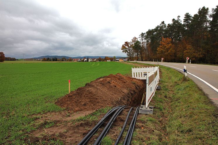 Die Bayernwerk Netz GmbH verlegt entlang der Staatsstraße St 2156, wie hier bei Grafenricht, leistungsstarke Mittelspannungskabel. Die Maßnahme ist Teil eines großen Projektes zwischen dem Schalthaus Buchtal und dem Umspannwerk Schwarzenfeld. In den kommenden Wochen werden weitere Leitungen mittels Spülbohrung schonend unterhalb der Straße verlegt.