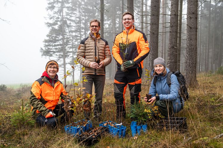 Im Auftrag der Bayernwerk Netz GmbH entsteht in Kirchenlamitz im Landkreis Wunsiedel ein klimastabiler Zukunftswald. Von links: Stephanie Huber (WBD Hochfranken), Harald Wolz (Bayernwerk Netz), Julian Brandner (Forstservice Brandner) und Lisa Ott (BKLS)