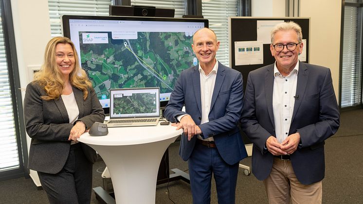 Von links nach rechts: Dr. Daniela Groher, Dr. Egon Leo Westphal und Albert Zettl zeigen das digitale Modul SNAP, das eine schnelle und unverbindliche Netzanschlussprüfung ermöglicht. SNAP gibt somit Planern und Projektanten dezentraler Einspeiseanlagen eine hilfreiche Orientierung.