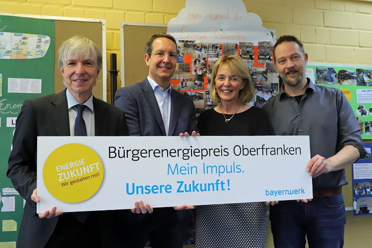 Am Freitag (31. Januar) ist der Startschuss für den Bürgerenergiepreis 2020 gefallen. Der Auftakt mit (v.L.) Thomas Engel (Regierungsvizepräsident), Ingo Schroers (Mitglied der Geschäftsleitung der Bayernwerk Netz GmbH), Katja Färber (Schulleiterin) und Marco Roder (Projektleiter und stv. Schulleiter) war in der Grund- und Mittelschule Hummeltal (Landkreis Bayreuth), einem der Vorjahressieger.