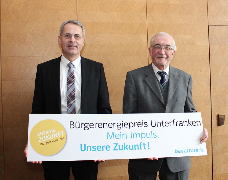 Regierungspräsident Dr. Paul Beinhofer (rechts) und Christoph Henzel, Leiter Kommunalmanagement Bayernwerk AG, zum Auftakt des Bürgerenergiepreises Unterfranken.