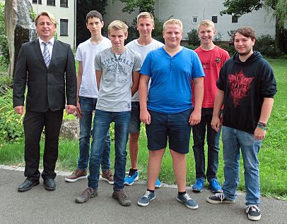 Ausbildungsverantwortlicher Alexander Nöchel mit den unterfränksichen Berufsstartern beim Bayernwerk: Nico Arnold; Maximilian Reinhart; Sven Schneider; Kevin Merkert; Florian Schwing; Tobias Kettemer (v.l.n.r.). Am Bayernwerk-Standort starten zum 1. September sechs Jugendliche ihre Ausbildung zum Elektroniker für Betriebstechnik.