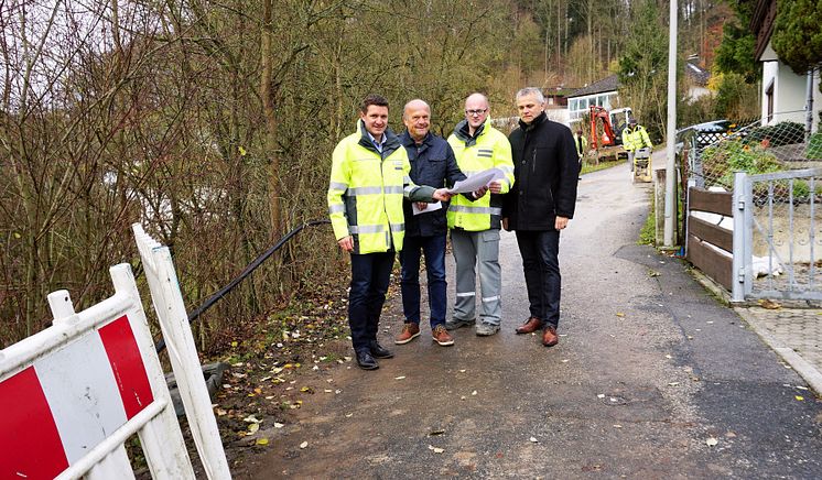 Netzbauleiter Markus Segerer ging gemeinsam mit Bürgermeister Johann Lanzhammer, Baubegleiter Gerald Gottschalk und Kommunalbetreuer Stephan Leibl (von links) die Pläne der Baumaßnahme des Bayernwerks durch.