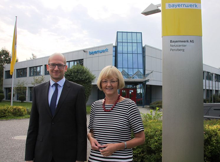 Florian Fischer, Netzbauleiter am Netzcenter Penzberg, und Ursula Jekelius, Regionalleiterin Oberbayern, nannten Details zu einzelnen Baumaßnahmen im Gebiet des Netzcenters Penzberg (v.l.).
