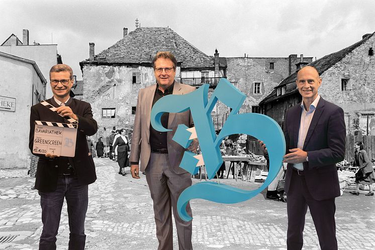 Greenscreen Bavariathek nachher v.l.n.r.: Staatsminister für Wissenschaft und Kunst, Bernd Sibler, Direktor Dr. Richard Loibl (HdBG) und Dr. Egon Leo Westphal, Mitglied des Vorstands der Bayernwerk AG vor der historischen Stadtkulisse Regensburgs. Das Hintergrundbild wurde 1953 am Donaumarkt aufgenommen, heute befindet sich an genau dieser Stelle der Museumsladen