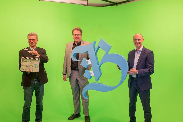 Greenscreen Bavariathek_vorher v.l.n.r.: Staatsminister für Wissenschaft und Kunst, Bernd Sibler, Direktor Dr. Richard Loibl (HdBG) und Dr. Egon Leo Westphal, Mitglied des Vorstands der Bayernwerk AG, vor dem Greenscreen im Medienlabor der Bavariathek.