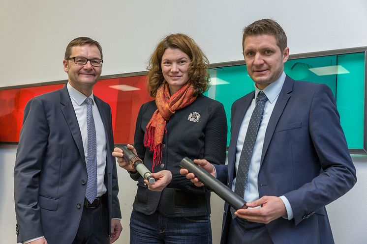 Bayernwerk-Chef Reimund Gotzel (links), Landrätin Tanja Schweiger und Markus Segerer, Netzbauleiter am Bayernwerk-Netzcenter Parsberg, mit Modellen eines 20-kV-Mittelspannungskabels.