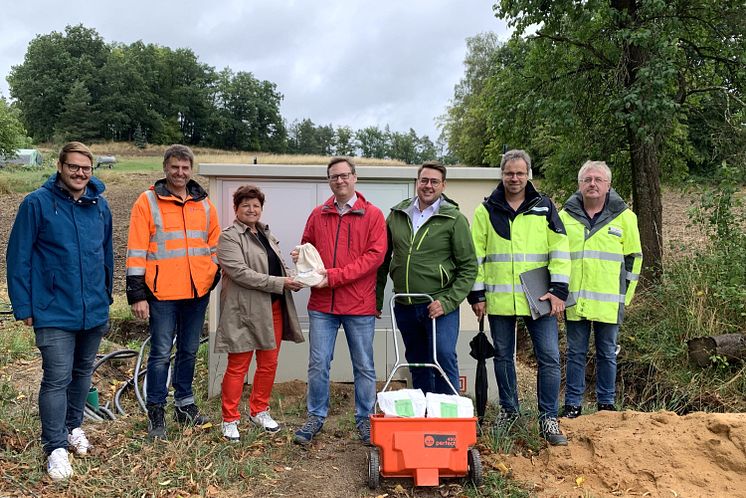 Vertreter der Gemeinde Brennberg nehmen an der neuen digitalen Ortsnetzstation in Hochaigen nachhaltige Blumensamen von der Bayernwerk Netz GmbH entgegen (v.l.n.r.): Daniel Reichl, Bauamtsleiter in Brennberg, Albert Gassner, Projektleiter bei der Partnerfirma Freitag Gruppe, Irmgard Sauerer, 1. Bürgermeisterin Gemeinde Brennberg, Wolfgang Dumm, Kommunalbetreuer (Bayernwerk Netz GmbH), Georg Wallaschek, Referent für Nachhaltigkeit (Bayernwerk AG), Harald Eigenstetter, Projektleiter (Bayernwerk Netz GmbH), Philipp Bohn, Baubegleiter (Bayernwerk Netz GmbH).