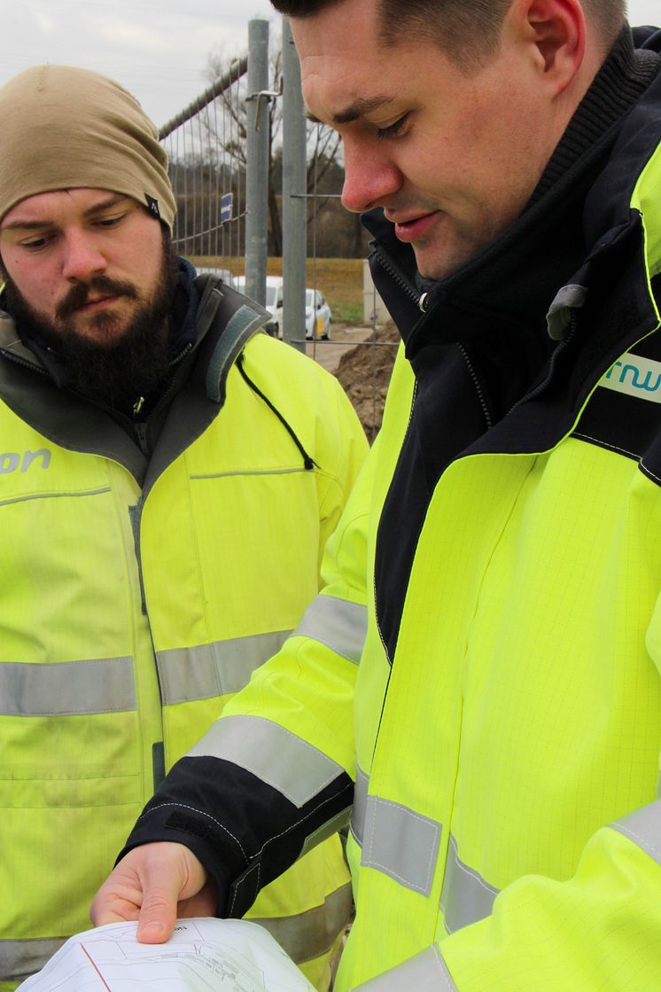 Netzbauleiter Maximilian Schmauß (r.) bespricht mit Baubegleiter Manuel Lackner (beide Bayernwerk Netz GmbH) die Pläne für die Spülbohrung in Marktl.