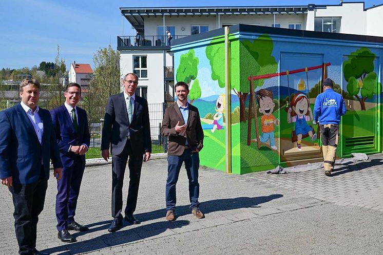 Ralf Schwarz, Bayernwerk Kommunalmanager, Michael Abraham, 1. Bürgermeister Rehau, Ulrich Beckstein, Kämmerer Rehau, und Markus Seidel, Leiter des Bayernwerk Kundencenters Naila, begutachten die Fertigstellung der Stationsbemalung am Schillerplatz durch art-efx.