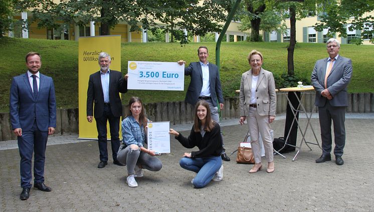 Bürgermeister Taufkirchen (Vils) Stefan Haberl, Schulleiter der Realschule Taufkirchen (Vils) Josef Hanslmaier, die Schülerinnen Pia Maier und Lisa Hellinger, Ingo Schroers, Mitglied der Geschäftsleitung der Bayernwerk Netz GmbH, Regierungspräsidentin Maria Els und stellvertretender Landrat Rainer Mehringer freuen sich über die Auszeichnung