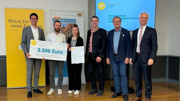 Sarah Beck-Trojer und Daniel Trojer aus Rudelzhausen. BU von links: Markus Leczycki, Leiter Kommunalmanagement Bayernwerk Netz GmbH, Daniel Trojer, Sarah Beck-Trojer aus Rudelzhausen, Preisträger, Michael Krumbucher, 1. Bürgermeister Rudelzhausen, Robert Wäger, stellvertretender Landrat Landkreis Freising, Konrad Schober, Regierungspräsident Regierung von Oberbayern