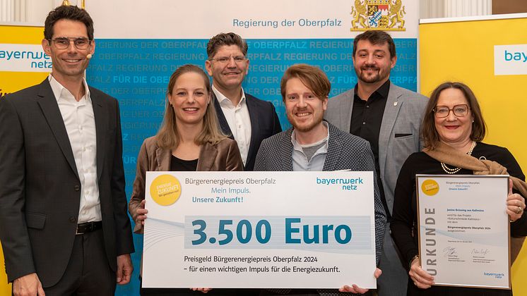 Bürgerenergiepreis Oberpfalz - Preisträger Kulturschmiede Kallmünz: Von links nach rechts: Markus Leczycki (Leiter Kommunalmanagement der Bayernwerk Netz GmbH), Preisträgerin Janine Brüssing aus Kallmünz, Béla Szabó (Geschäftsführer KERL), Preisträger Philippe Matic-Arnauld des Lions, Maximilian Köckritz (Geschäftsführer KERL und Vertreter der Landrätin), Regierungsvizepräsidentin Christiane Zürn.