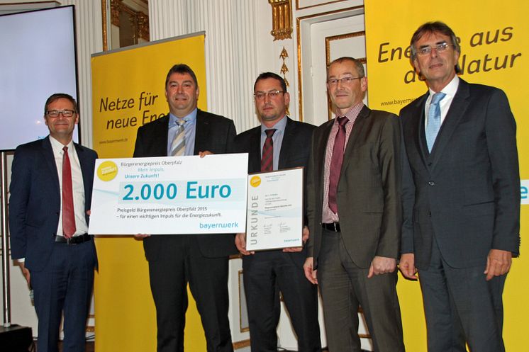 Der 1. FC Rieden erhält den Bürgerenergiepreis Oberpfalz 2015. Der Verein hat in den letzten Jahren zahlreiche Maßnahmen umgesetzt, um Energieeinsparungen zu erzielen und regenerative Energien zu nutzen. Auf dem Bild von links: Reimund Gotzel (Vorstand Bayernwerk), Richard Weigert, Hans Fischer (beide 1. FC Rieden), Erwin Geitner (1. Bürgermeister Rieden) und Axel Bartelt (Regierungspräsident).