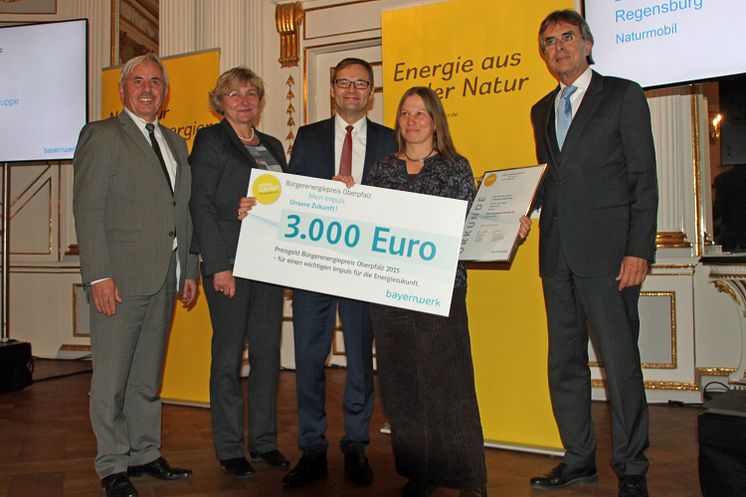 Der Bund Naturschutz - Kreisgruppe Regensburg erhält den Bürgerenergiepreis Oberpfalz 2015. Das Naturmobil bietet Schülern die Möglichkeit, die Natur, Pflanzen und Kleinstlebewesen hautnah zu entdecken. Auf dem Bild von links: Jürgen Huber (Stadt Regensburg), Maria Politzka (Landratsamt Regensburg), Reimund Gotzel (Vorstand Bayernwerk), Dr. Angela Nunn (BN) und Axel Bartelt (Regierungspräsident).
