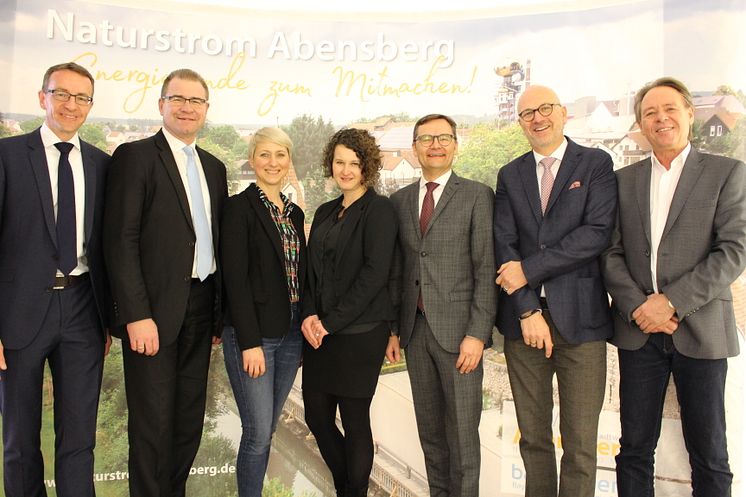 v.l.: Thomas Oppelt (Bayernwerk Regio Energie GmbH), Dr. Alexander Fenzl (Mitglied der Geschäftsführung Bayernwerk Natur GmbH, Bereichsleiter Unternehmensentwicklung Bayernwerk AG), Silvia Fränkel und Carolin Wohlgemuth (Stadtmarketing Abensberg), Reimund Gotzel (Vorstandsvorsitzender Bayernwerk AG), Dr. Uwe Brandl (Erster Bürgermeister Stadt Abensberg) und Hans Schmid (Leiter Stadtwerke Abensberg).