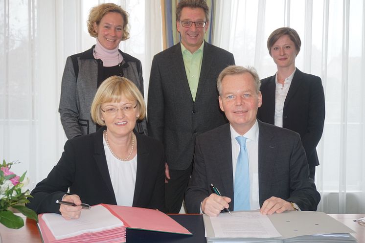 Bei der Vertragsunterzeichnung: vordere Reihe: Ursula Jekelius (links), oberbayerische Regionalleiterin des Bayernwerks, und Erster Bürgermeister Jan Neusiedl (rechts). hintere Reihe vl: Silke Mall, Kommunalbetreuerin des Bayernwerks, Peter Kleßinger, stellv. Leiter der Bauverwaltung und Anja Reinhardt vom Kommunalbereich des Bayernwerks und Geschäftsführerin der neu gegründeten Gesellschaft