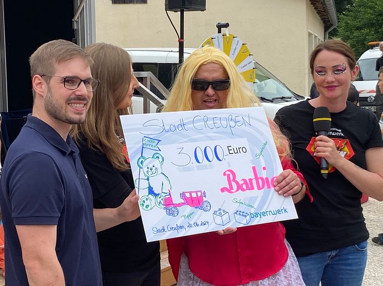 Wette gewonnen: Creußens Bürgermeister Martin Dannhäußer (mitte) verkleidet als Barbie freut sich über den Wettgewinn des Bayernwerks mit Bayernwerk-Kommunalbetreuer Marcel Boiger (links) und Moderatorin Dany Füg (rechts).