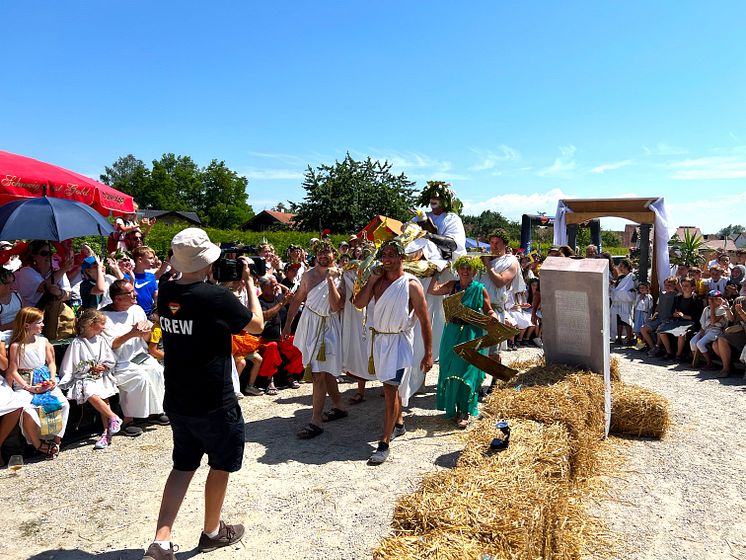 Bürgermeister-Aufgabe: Bürgermeister Robert Otter wird zu Jupiter, dem König der römischen Götter, der von einem Adler begleitet auf einer goldenen Sänfte durch die Menge getragen wird und für Blitz und Donner sorgt.
