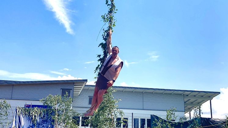 Bürgermeister-Aufgabe: Stefan Kumpf wird zu Tarzan, der an einer Liane schwingt und seinen berüchtigten Tarzan-Schrei loslässt.