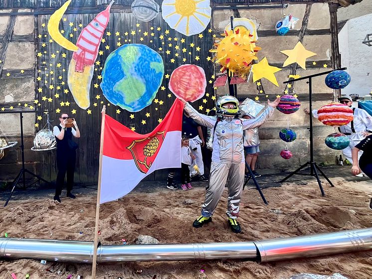 Bürgermeisterinnen-Aufgabe: Regina Bruckmann landet mit einer Rakete auf dem Mond und hisst dort die Flagge der Gemeinde Lonnerstadt.