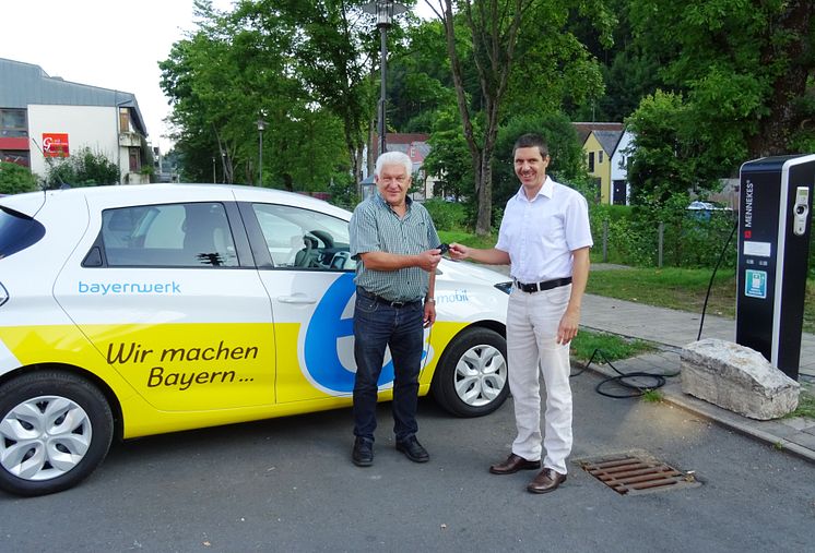 Bayernwerk-Kommunalbetreuer Burkhard Butz (r.) übergibt den Schlüssel eines Renault Zoé aus dem Bayernwerk-Fuhrpark an Waischenfelds Ersten Bürgermeister Edmund Pirkelmann (l.).