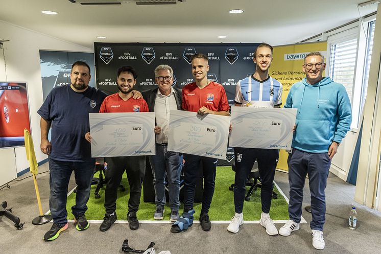 Die Bayernwerk Netz hat gemeinsam mit dem Bayerischen Fußballverband ein E-Sport Turnier in Kolbermoor veranstaltet. Bei der Siegerehrung nahmen Hüseyin Akay (2 v. l.), Nick Holste (3 v. r.) und Maximilian May (2 v. r.) ihre Preise entgegen.