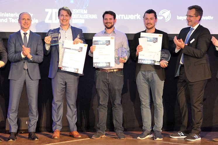 Die Gewinner des Energie Start-up Bayern 2018 freuen sich über Ihre Auszeichnung: (mittig v.l.n.r.) Turbonik, Dr. Johannes Grob (Platz 1); ENER-IQ, Sven Rausch (Platz 3); ChargeX, Tobias Wagner (Platz 2); Gratulation der Partner des Energie Start-up Bayern 2018: Bayernwerk AG, Dr. Egon Westphal (ganz links) und Bayern Innovativ GmbH, Dr. Rainer Seßner (ganz rechts).