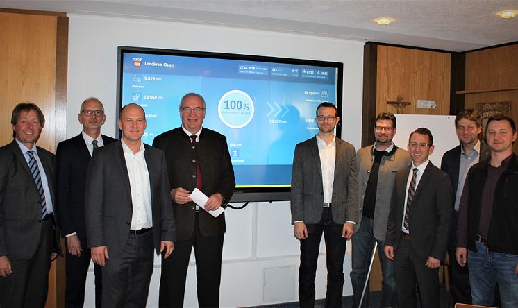 Landrat Franz Löffler (4.v.l.) und Dr. Andrè Zorger (3.v.r.) beim Bayernwerk zuständig für die Region Ostbayern, stellten zusammen mit Vertretern des Bayernwerks, der Kreiswerke Cham und der regionalen Netzbetreiber im Landkreis Cham den EnergieMonitor vor.