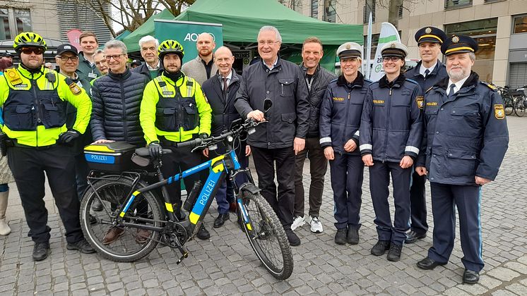 Bayerns Innenminister Joachim Herrmann (Mitte), Landesverkehrswacht-Präsident und Staatsminister a.D. Bernd Sibler (vorne, 2. von links), Polizeipräsident Adolf Blöchl (rechts), Dr. Egon Leo Westphal, CEO Bayernwerk AG (vorne, 4. von links) und Andreas Kaiser, AOK Bayern (hinten, Mitte) mit Vertretern der Bayerischen Polizei.