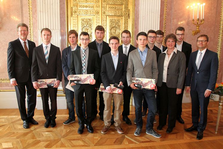 Foto: Die Jungforscher gemeinsam mit Staatsminister Dr. Marcel Huber (links), Bayernwerk-Vorstand Reimund Gotzel (rechts) und Jugend forscht-Wettbewerbsleitung Dr. Monika Christl (2.v.r.)..