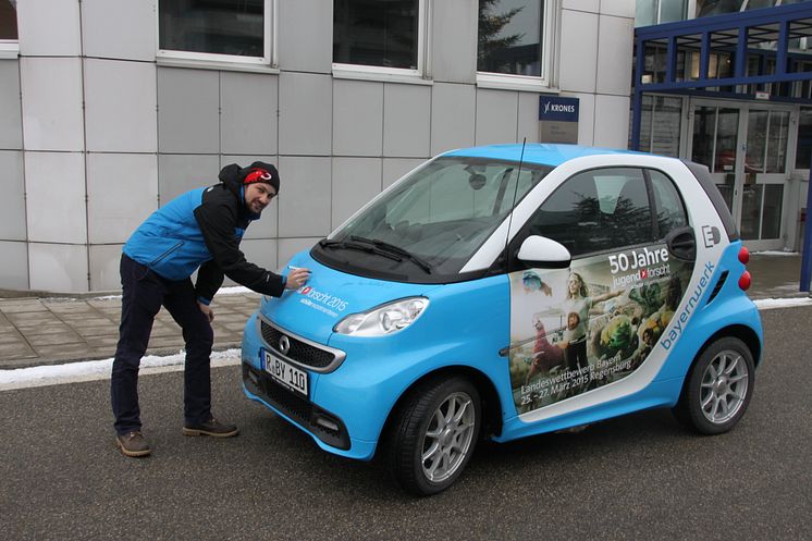 Bildtext: Mit dem „50 Jahre Jugend forscht E-Smart“ trifft das Patenunternehmen Bayernwerk ehemalige bayerische Preisträger, hier Lukas Kerner, und lässt diese das Elektroauto signieren.