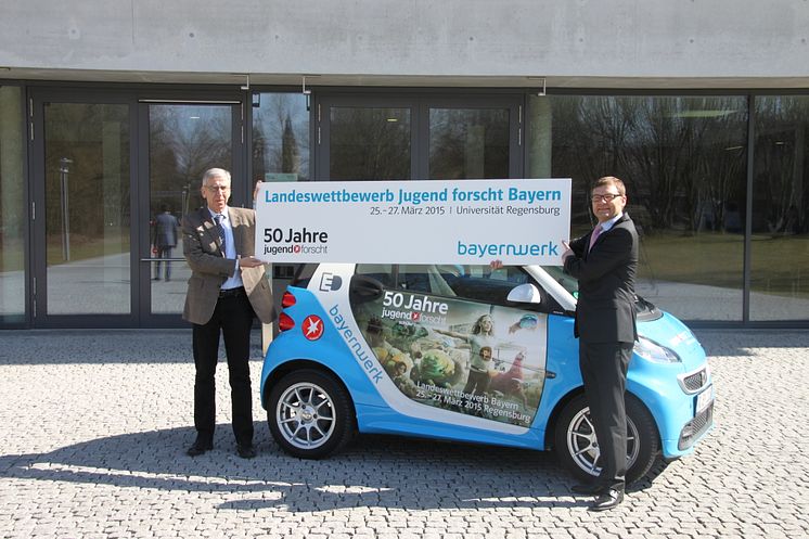Foto: Uni-Präsident Prof. Dr. Udo Hebel und Reimund Gotzel, Vorstandsvorsitzender der Bayernwerk AG geben den Startschuss zum anstehenden Landeswettbewerb in Regensburg