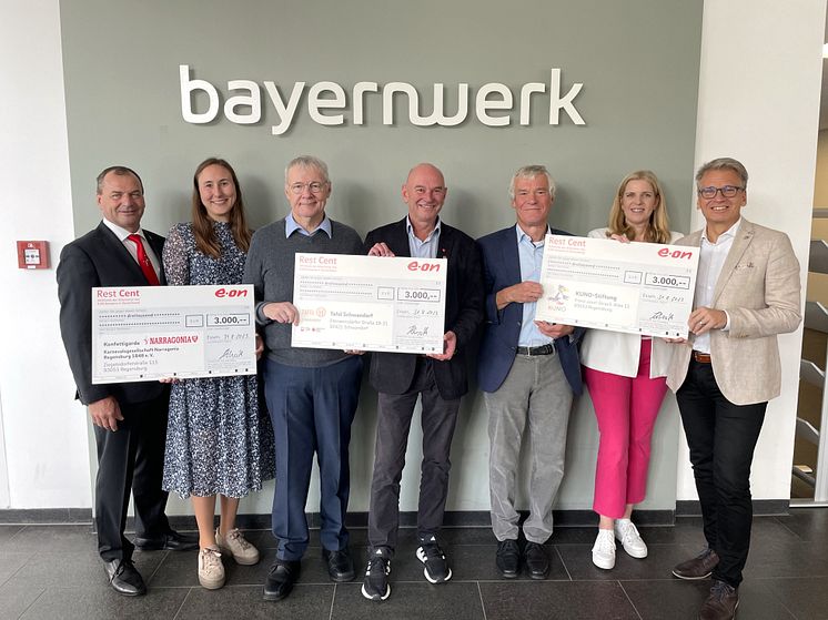 Spendenübergabe in der Unternehmensleitung der Bayernwerk AG (v.li.): Narragonia-Präsident Erich Lichtl, Marlene von der Sitt (Bayernwerk), Franz Rother von der Schwandorfer Tafel, Lothar Haberzeth, Betriebsratsvorsitzender beim Bayernwerk für die Region Ostbayern, Prof. em. Dr. Hugo Segerer, Vorstand der KUNO-Stiftung, Bayernwerk-Betriebsrätin Tanja Kagerer und Jürgen Gorki, Leiter Vertrieb & Marketing der Bayernwerk AG.