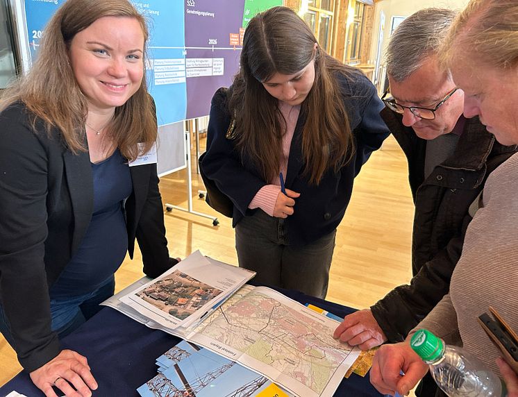 Genehmigungsmanagerin Franziska Polz (l.) am Dienstag, 22. Oktober, im Gespräch mit Eigentümern und Pächtern. Bei einem Infoabend hat die Bayernwerk Netz über den Planungsstand für die Modernisierung der Leitung zwischen Altdorf und Altheim informiert.