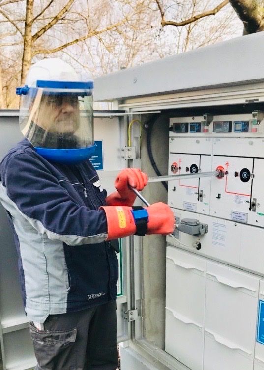 Der neu entwickelte Sensor am Arm warnt akustisch und visuell bei Annäherung an stromführende Bauteile.
