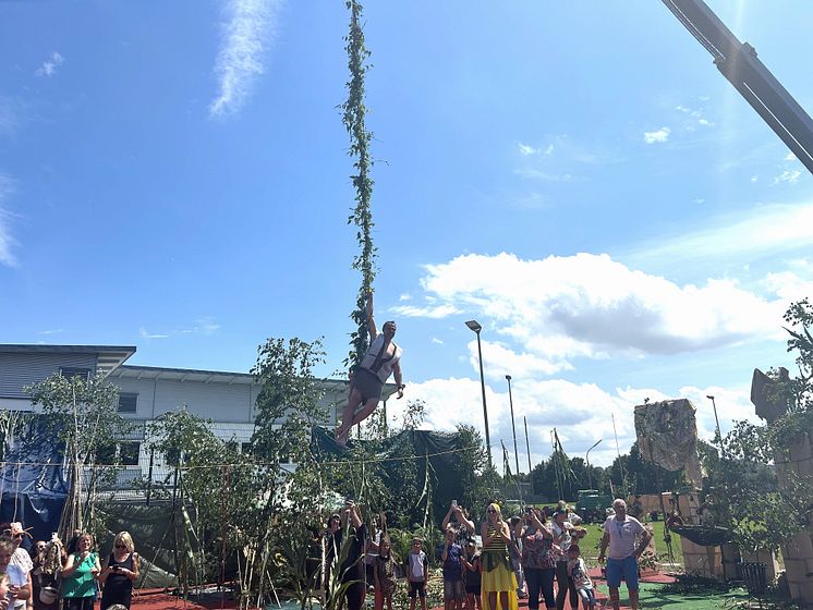 Bürgermeister-Aufgabe: Stefan Kumpf wird zu Tarzan, der an einer Liane schwingt und seinen berüchtigten Tarzan-Schrei loslässt.