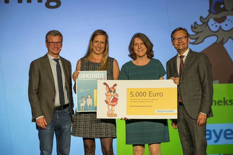 Kinderbibliothekspreis 2019 für die Gemeindebibliothek Unterföhring (v.l.): Bernd Sibler, Bayerischer Staatsminister für Wissenschaft und Kunst, Verena Reber und Ilse Werner von der Gemeindebibliothek Unterföhring, Reimund Gotzel, Vorstandsvorsitzender Bayernwerk AG.