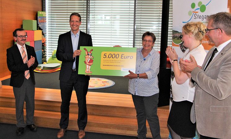 Den Kinderbibliothekspreis im Wert von 5.000 Euro überreichte gestern Ingo Schroers vom Bayernwerk an Bibliotheksleiterin Cornelia Kempgen (mi.). Pfarrer Walter Ries (li.), Dr. Claudia Pecher vom St. Michaelsbund (2. v.r.) und Bürgermeister Thilo Wagner (r.) gratulierten.