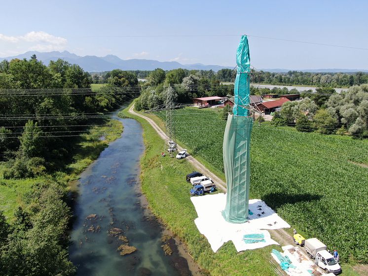Ein Hochspannungsmast wird gereinigt und erhält einen frischen Anstrich