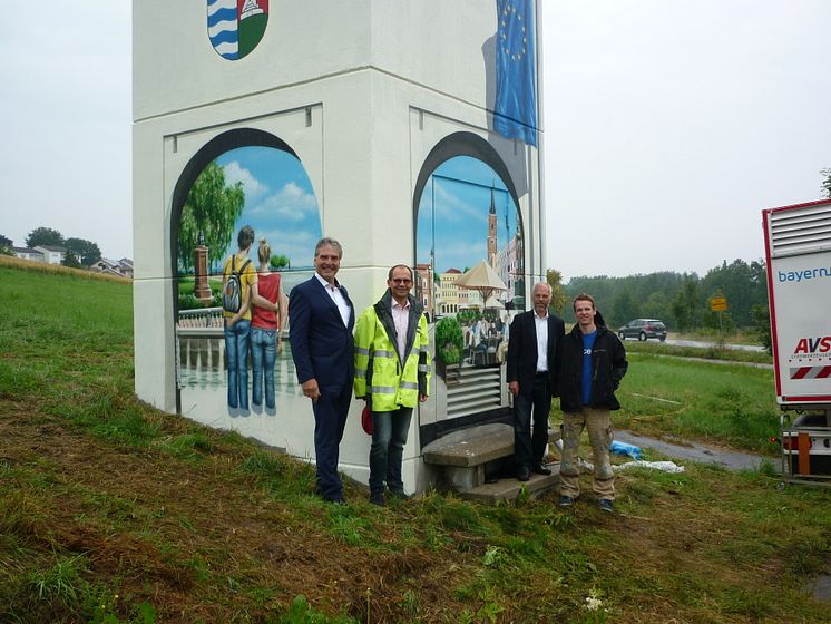 v.l.: Bayernwerk-Kommunalbetreuer Franz-Josef Bloier, Jürgen Hoffmeister, Netzbauleiter am Bayernwerk-Kundencenter Eggenfelden, Erster Bürgermeister Wolfgang Grubwinkler und Spraykünstler Markus Ronge von Art-EFX.