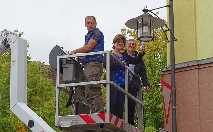 Die letzte Straßenleuchte ist Chefsache: Greußenheims Bürgermeisterin Karin Kuhn (M.), Bayernwerk-Kommunalbetreuer Frank Schneider (r.) und Uwe Rup-pert (l.) von der beteiligten Partnerfirma setzen den Schlusspunkt hinter die LED-Umrüstung.
