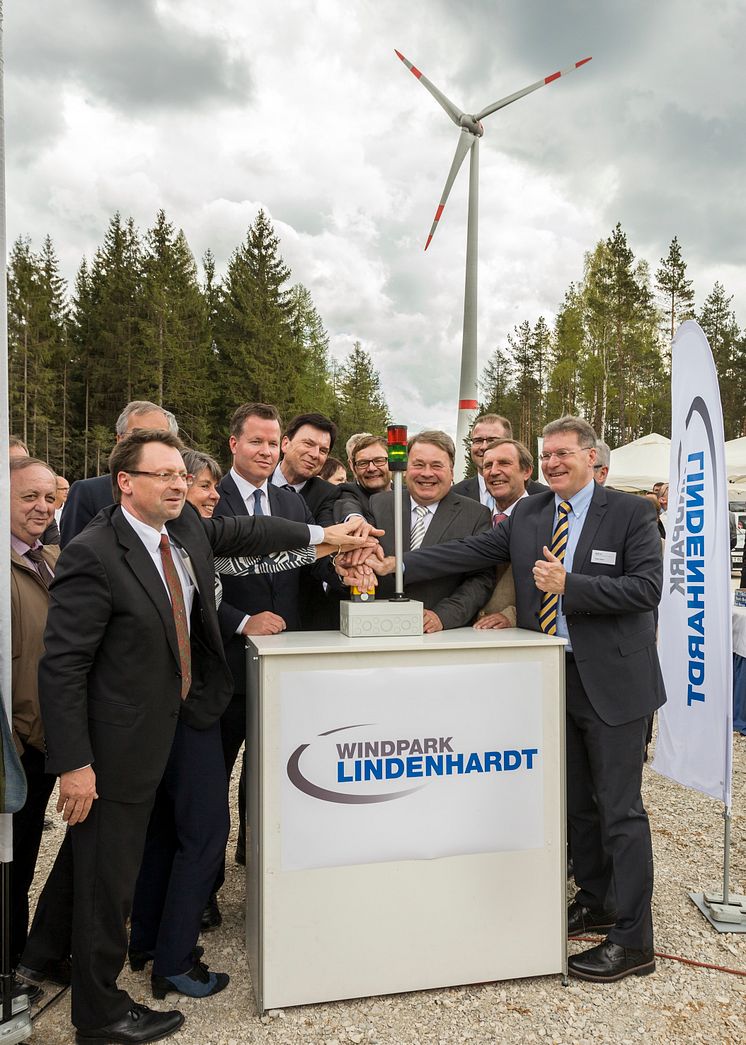 Los geht’s: Bei der feierlichen Eröffnung am Montag haben Investoren, Landwirtschaftsminister Helmut Brunner und Ehrengäste den symbolischen Startknopf für den Windpark Tannberg-Lindenhardt südlich von Bayreuth gedrückt.