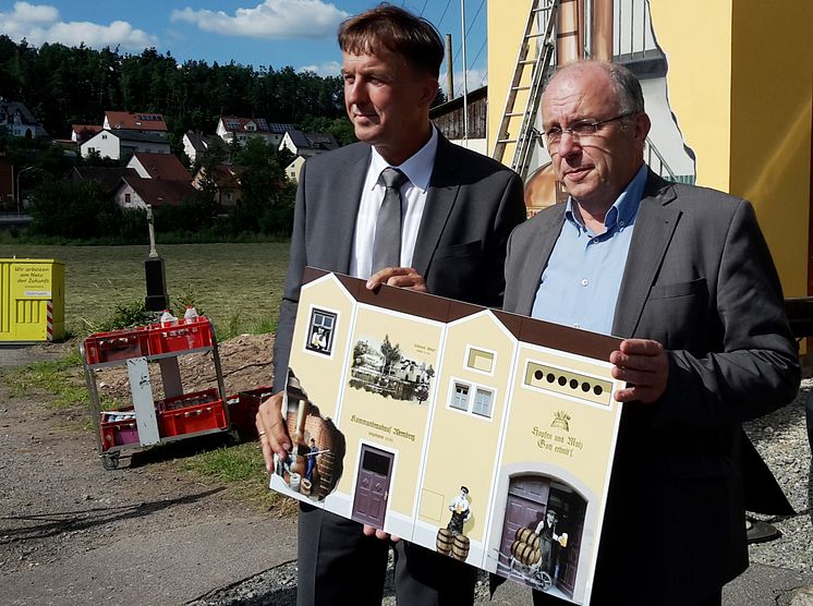 Martin Hanner vom Bayernwerk und Bürgermeister Georg Butz präsentieren den "Hopfentransformator".