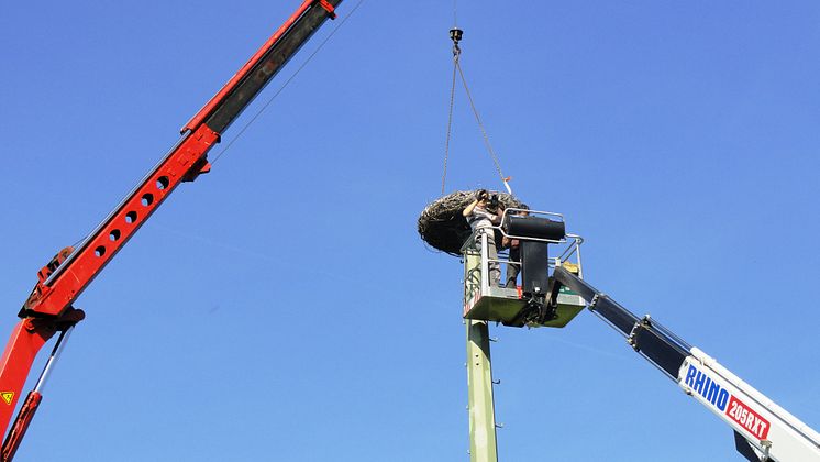 Mit Hilfe eines Krans hat eine Bürgerinitiative aus Hainberg den Storchenhorst auf dem stillgelegten Strommasten in Geiselsdorf angebracht.